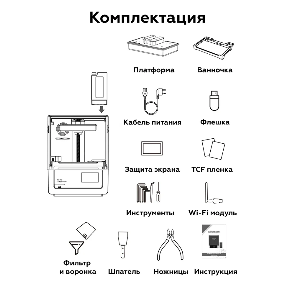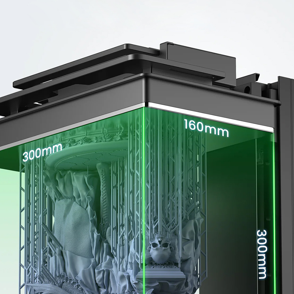 Принтер оснащен 5-дюймовым сенсорным экраном для удобного управления и совместим с популярными слайсерами: UniFormation Slicer, Chitubox и Lychee. Данные можно передавать через USB, Wi-Fi или Ethernet, а рабочая область 300x160x300 мм позволяет печатать крупные модели за один цикл.